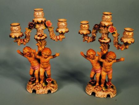 pair vintage porcelain three arm candlesticks with children 12"h,8"w pair vintage porcelain three arm candlesticks with children 12"h,8"w