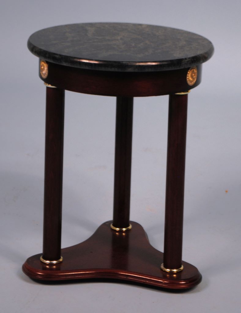 small mahogany stand with black and green marble top 12" dia,15 1/2 h. small mahogany stand with black and green marble top 12" dia,15 1/2 h.
