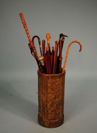 Plaster painted gold umbrella or cane holder. Fancy relief design. Lot includes variety of canes 23"h, 10 1/2" dia. Plaster painted gold umbrella or cane holder. Fancy relief design. Lot includes variety of canes 23"h, 10 1/2" dia.