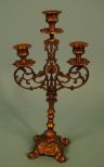 Three arm brass candlestick, scroll ornate arms, turned center stem, rococo feet. 7"w,14"h Three arm brass candlestick, scroll ornate arms, turned center stem, rococo feet. 7"w,14"h