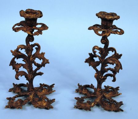 pair rococo style iron candlesticks 8"h. pair rococo style iron candlesticks 8"h.