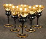 set of six Smokey colored stems with hand painted enamel designs along with brass mirror plateau 6"h set of six Smokey colored stems with hand painted enamel designs along with brass mirror plateau 6"h