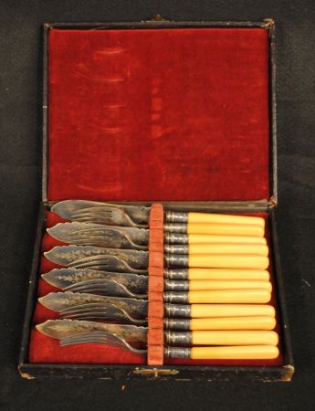 Victorian silver plate bladed, bone handled fish set in original box Victorian silver plate bladed, bone handled fish set in original box