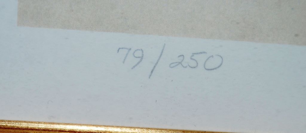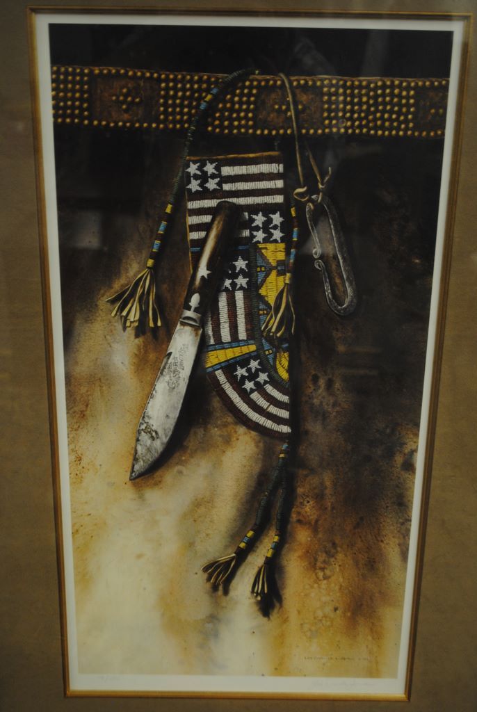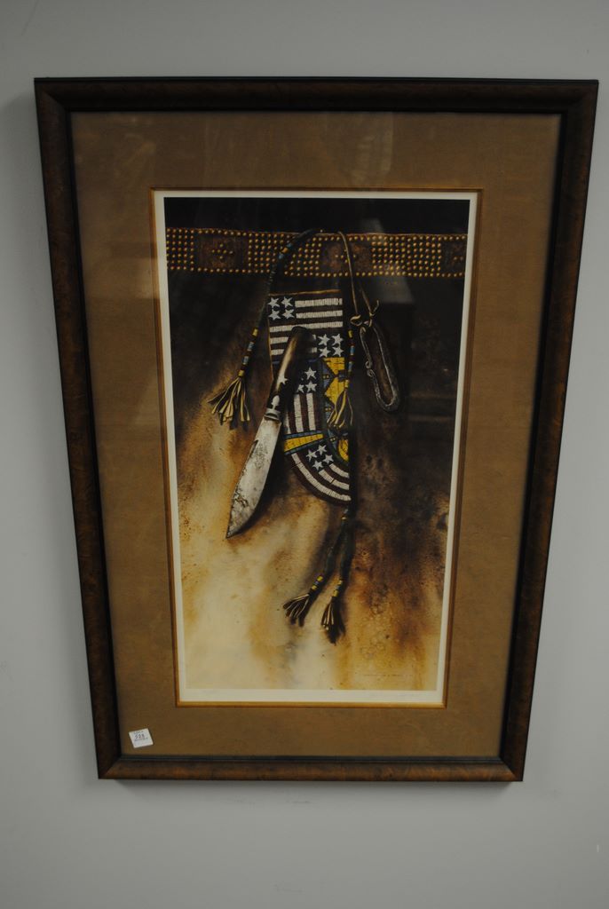 One Indian print by Lisa Danielle Lorimer, 1982, signed and numbered, 79/250, framed in brown suede and gold liner-depicts beautiful Indian beaded knife sheath and knife, et sec. Burled frame. One Indian print by Lisa Danielle Lorimer, 1982, signed and numbered, 79/250, framed in brown suede and gold liner-depicts beautiful Indian beaded knife sheath and knife, et sec. Burled frame.
