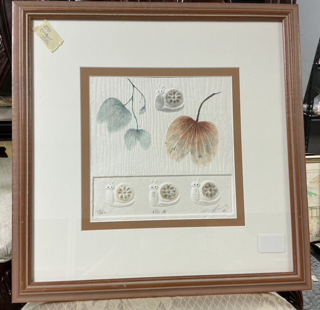 18 x 16 Asian Artist Snail Embossed Paper Artwork, matted, framed, Location Room 3 Shelf 6 18 x 16 Asian Artist Snail Embossed Paper Artwork, matted, framed, Location Room 3 Shelf 6