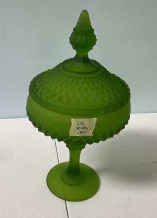 336 12"h Indiana Green Satin Frosted Pedestal Lidded Dish