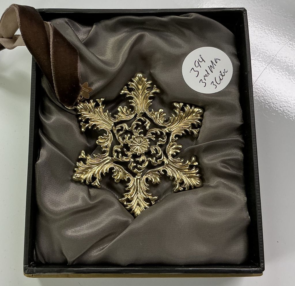 L Objet Snowflake1st Edition Gold Tone Ornament, with box, Location Room 3 Shelves 8 L Objet Snowflake1st Edition Gold Tone Ornament, with box, Location Room 3 Shelves 8