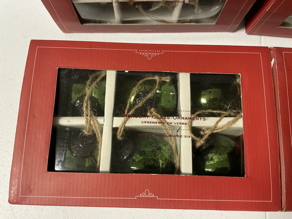 Four Boxes of Pottery Barn Mercury Glass Ornaments, 24 total, Location Room 3 Shelves 6 Four Boxes of Pottery Barn Mercury Glass Ornaments, 24 total, Location Room 3 Shelves 6