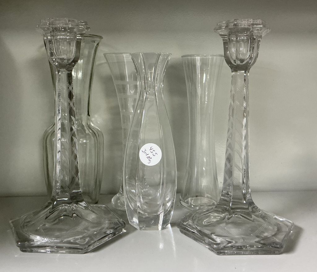 Etched Candle Holders and Glass flower Vases, Location Room 3 Shelves Etched Candle Holders and Glass flower Vases, Location Room 3 Shelves
