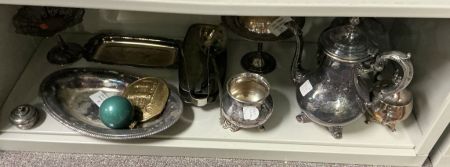 Large Collection of Silver Plate Serving Ware, Location Room 3 shelves Large Collection of Silver Plate Serving Ware, Location Room 3 shelves