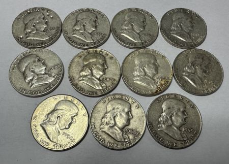 11 Franklin Half Dollars, 1951, 1951, 1952, 1963, 1954, 1957, 1963, 1963, 1954, 1958, and 1959, Location tall Case 11 Franklin Half Dollars, 1951, 1951, 1952, 1963, 1954, 1957, 1963, 1963, 1954, 1958, and 1959, Location tall Case