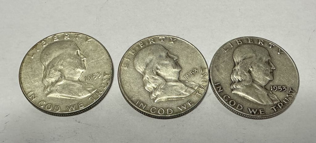 3 Franklin Half Dollars, 1953, 1953, and 1953, Location Tall Case 3 Franklin Half Dollars, 1953, 1953, and 1953, Location Tall Case