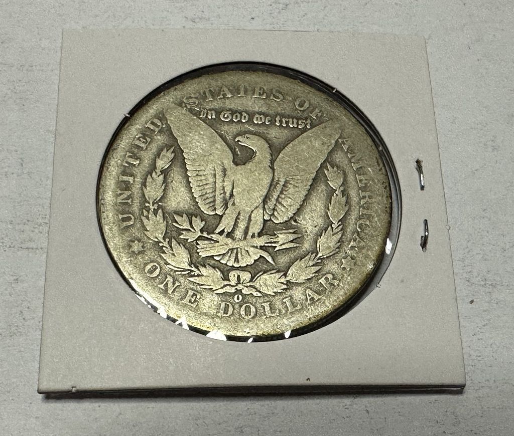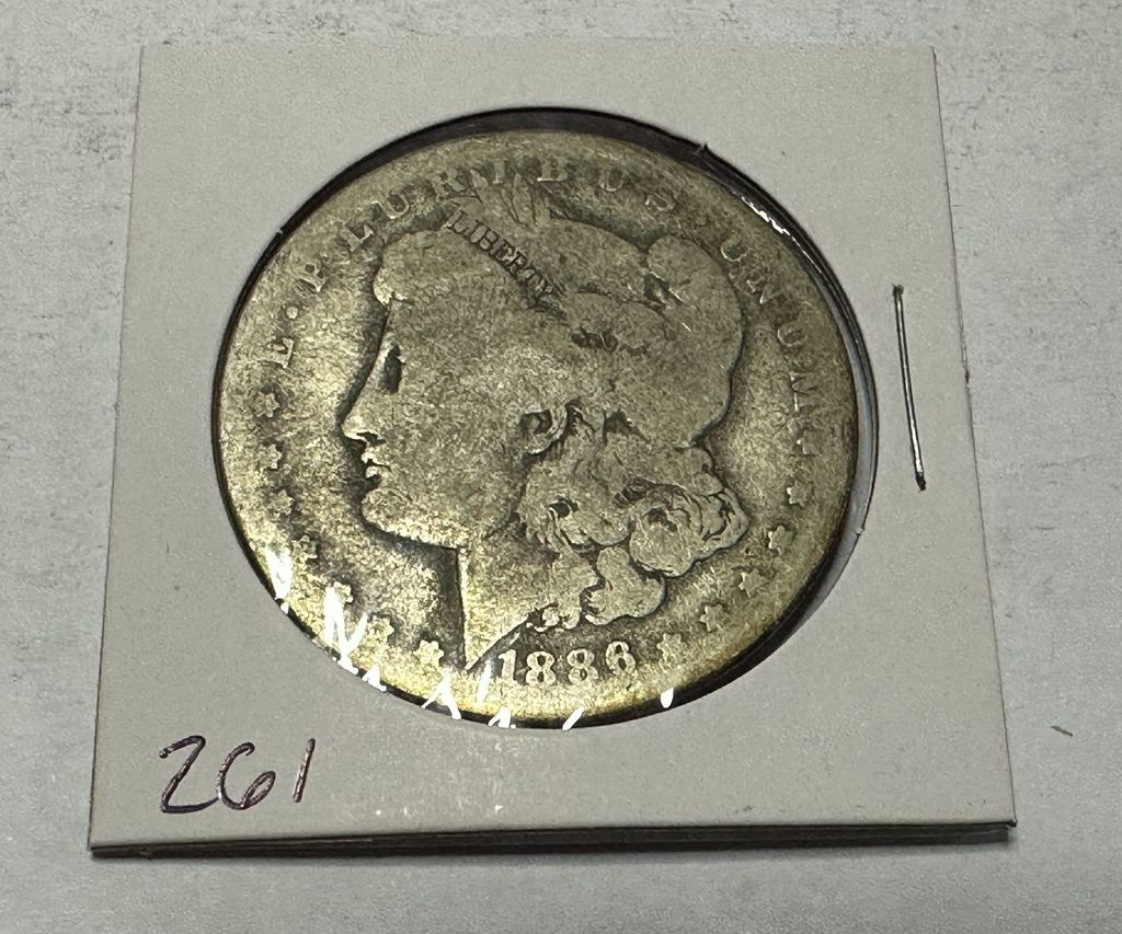 1886-O Morgan Silver Dollar, good, paper case, Location Tall Cases 1886-O Morgan Silver Dollar, good, paper case, Location Tall Cases