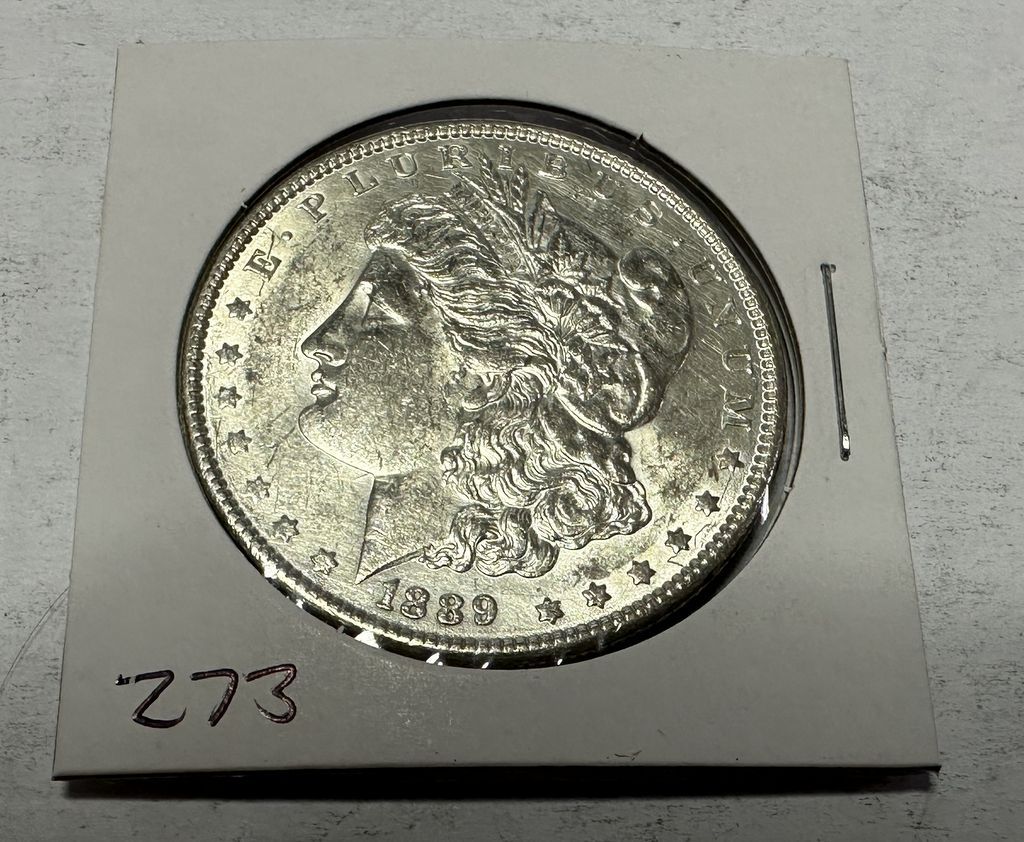 1889 Morgan Silver Dollar, fine, paper case, Location tall cases 1889 Morgan Silver Dollar, fine, paper case, Location tall cases