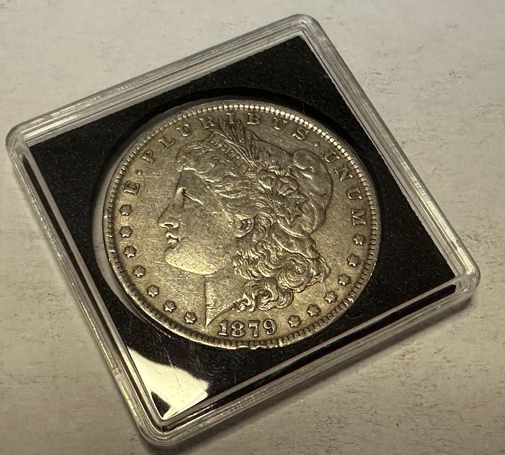 1879 Morgan Silver Dollar, fine, plastic case Location Tall Case 1879 Morgan Silver Dollar, fine, plastic case Location Tall Case