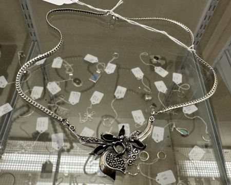 .925 Sterling Chain with Floral Pendent, Missing center stone, marcasite accents, Location Tall Case .925 Sterling Chain with Floral Pendent, Missing center stone, marcasite accents, Location Tall Case