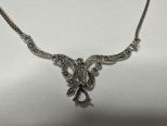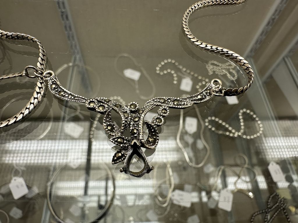 .925 Sterling Chain with Floral Pendent, Missing center stone, marcasite accents, Location tall Cases. 15 grams .925 Sterling Chain with Floral Pendent, Missing center stone, marcasite accents, Location tall Cases. 15 grams