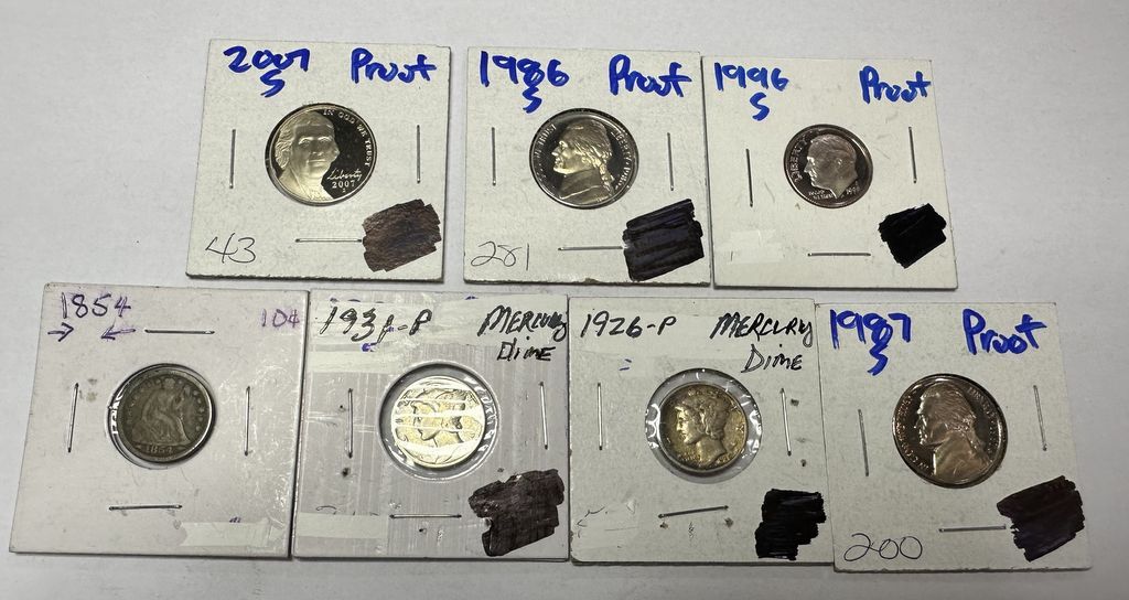 2007-S Proof Nickel, 1986-S Proof Nickel, 1996-S Proof Nickel, 1854 Sitting Liberty Dime, 1931-P Mercury Dime, 1926-P Mercury Dime, 1987-S Proof Nickel 2007-S Proof Nickel, 1986-S Proof Nickel, 1996-S Proof Nickel, 1854 Sitting Liberty Dime, 1931-P Mercury Dime, 1926-P Mercury Dime, 1987-S Proof Nickel