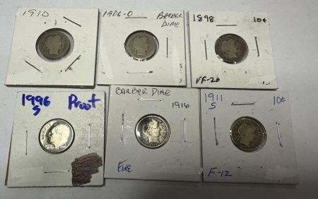 443 1910 Barber Dime, 1906-O Barber Dime, 1898 Dime, 1996-S Proof Dime, 1916 Barber Dime and 1911-S Dime