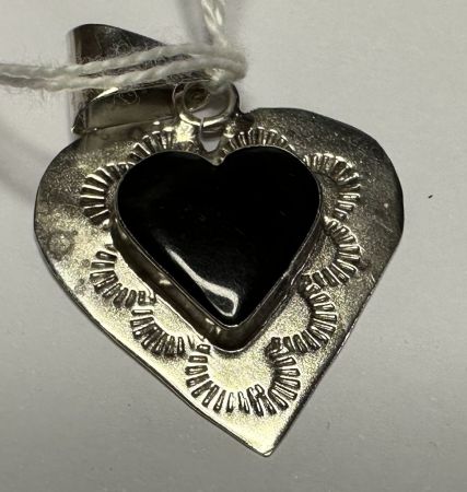 .925 Mexico Heart Pendent with Onyx; Etched details; 7.2 grams .925 Mexico Heart Pendent with Onyx; Etched details; 7.2 grams