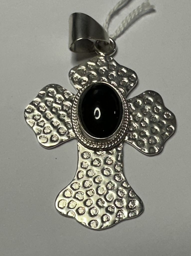 Mexico .925 Sterling Onyx Hammered Cross Pendant; 2"L; Hammered Texture; 21 grams Mexico .925 Sterling Onyx Hammered Cross Pendant; 2"L; Hammered Texture; 21 grams