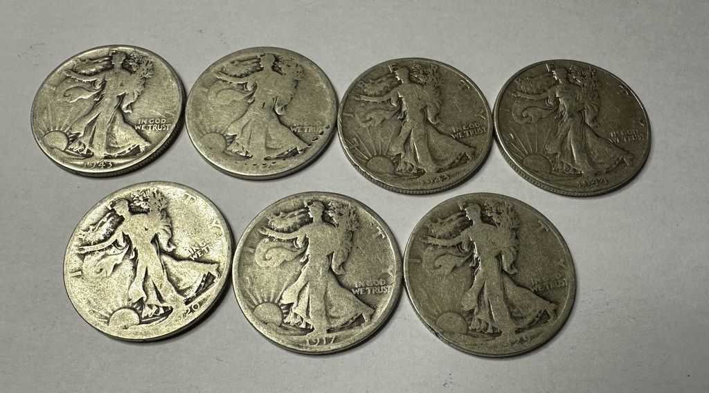 7 Walking Liberty Half Dollars, 1943, 1944, 1920, 1917, 1929 7 Walking Liberty Half Dollars, 1943, 1944, 1920, 1917, 1929