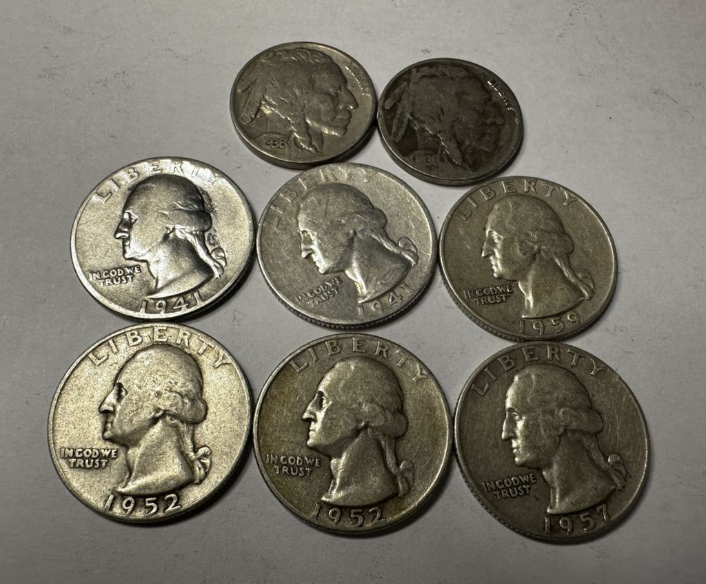 6 Silver Quarters, 1941, 1959, 1952, 1957, and Buffalo Nickels 1938, 1936. 6 Silver Quarters, 1941, 1959, 1952, 1957, and Buffalo Nickels 1938, 1936.