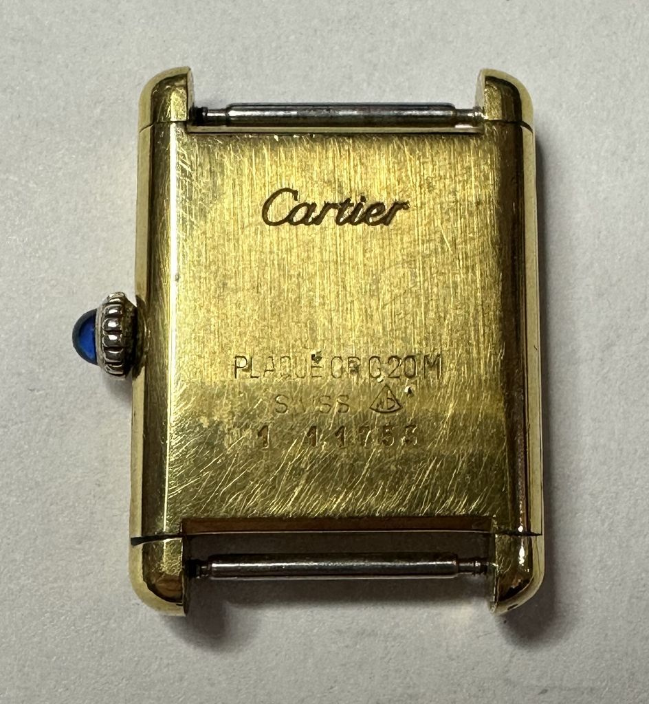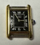 18k Gold Pre-Must Cartier Tank 23mm Watch, black roman numeral dial, manual wind, 1970's, missing strap, Swiss 1 11753, crystal has scratches, case also has worn spots, has lugs, crown is working order. 18k Gold Pre-Must Cartier Tank 23mm Watch, black roman numeral dial, manual wind, 1970's, missing strap, Swiss 1 11753, crystal has scratches, case also has worn spots, has lugs, crown is working order.