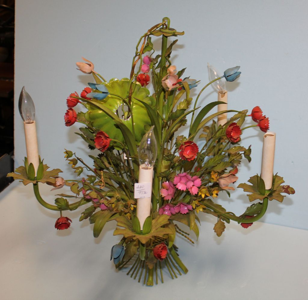 Very Decorative Green Floral Chandelier, tin, five light; 20 1/2" dia., 24 1/2" h. Very Decorative Green Floral Chandelier, tin, five light; 20 1/2" dia., 24 1/2" h.