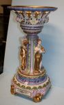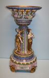 Large Hand Painted Porcelain Centerpiece; three standing ladies with musical instruments, reticulated basket all supported on four gold painted rococo legs; 29" h., 15" dia. Large Hand Painted Porcelain Centerpiece; three standing ladies with musical instruments, reticulated basket all supported on four gold painted rococo legs; 29" h., 15" dia.