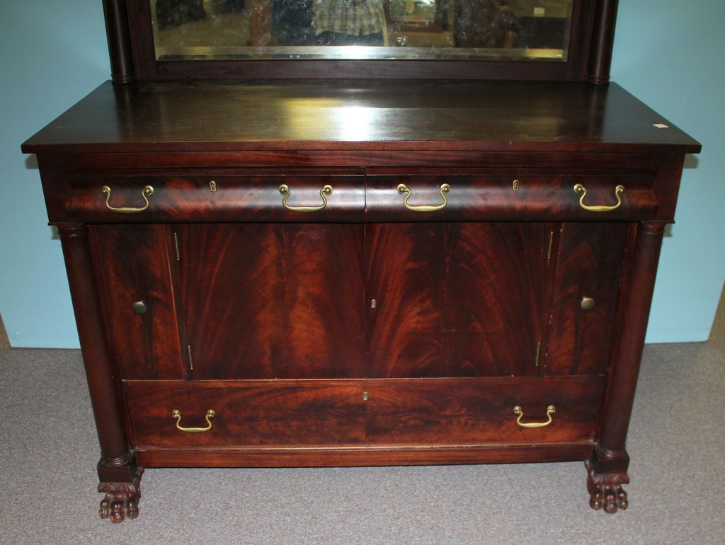 Mahogany Empire Revival Server with Beveled Mirror, two drawer over three doors and drawer at bottom, carved paw feet, columns on mirror; 54" w., 24 1/2" d., 57 1/2" h. Mahogany Empire Revival Server with Beveled Mirror, two drawer over three doors and drawer at bottom, carved paw feet, columns on mirror; 54" w., 24 1/2" d., 57 1/2" h.
