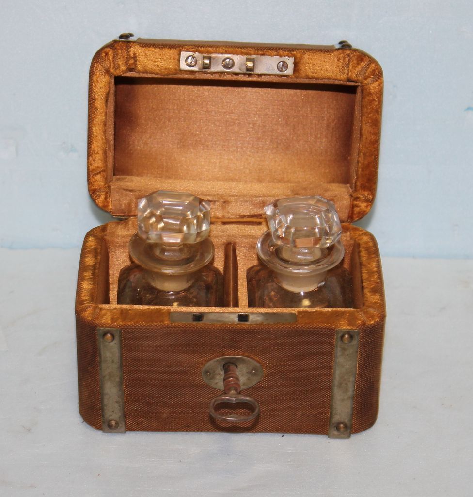Two 19th Century small bottles in original cloth covered box with key; 5" w., 4 1/2" h. Two 19th Century small bottles in original cloth covered box with key; 5" w., 4 1/2" h.