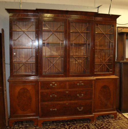 Large Two Piece Oyster Burl Breakfront, appears to be antique breakfront that has had veneer and other restoration, four divided glass doors, four drawers, two doors supported by bracket feet; 87" w., 86" h., 20" d. Large Two Piece Oyster Burl Breakfront, appears to be antique breakfront that has had veneer and other restoration, four divided glass doors, four drawers, two doors supported by bracket feet; 87" w., 86" h., 20" d.