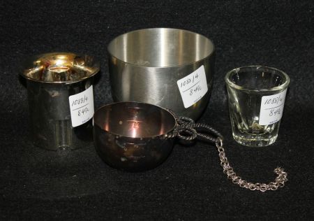Stieff Pewter "Jefferson Cup" 3 1/4" dia., Glass Jigger 2" h., Candle Holder 2 1/4" h. and a Silverplate Measure Cup 2 1/4" dia. Stieff Pewter "Jefferson Cup" 3 1/4" dia., Glass Jigger 2" h., Candle Holder 2 1/4" h. and a Silverplate Measure Cup 2 1/4" dia.