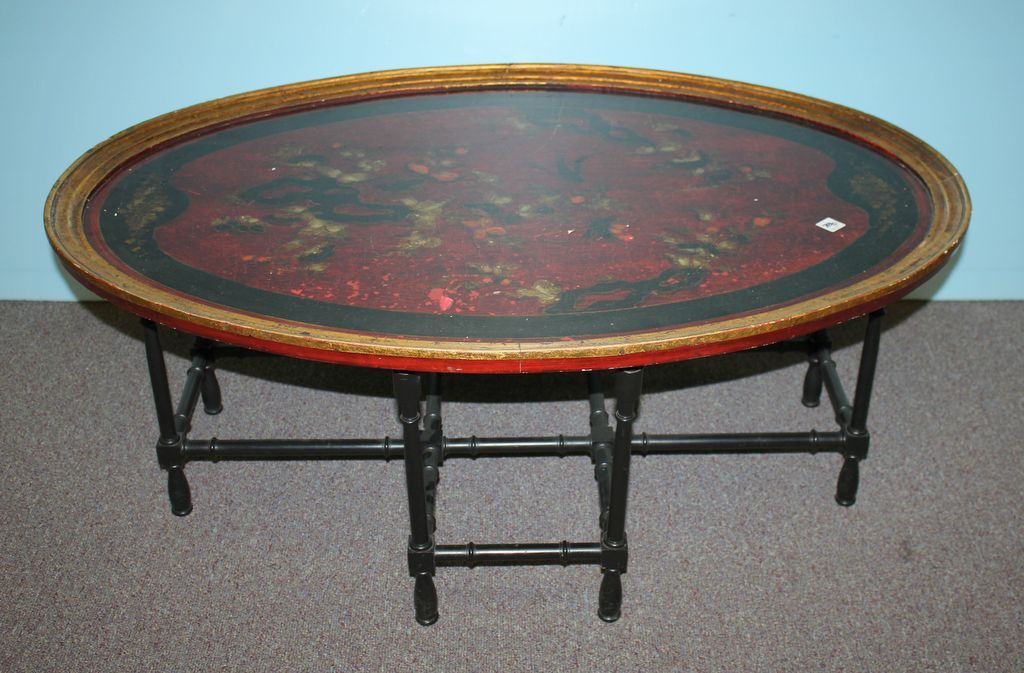 Paint Decorated Turn Leg Coffee Table, gold rim, black painted; 43" w., 17" h. Paint Decorated Turn Leg Coffee Table, gold rim, black painted; 43" w., 17" h.