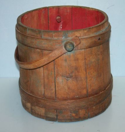Early Grain Bucket, red paint interior; 9" h., 8" dia. Early Grain Bucket, red paint interior; 9" h., 8" dia.