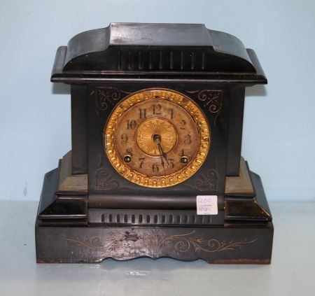 Vintage Black Slate Mantel Clock, missing glass cover; 11" w., 11" h. Vintage Black Slate Mantel Clock, missing glass cover; 11" w., 11" h.