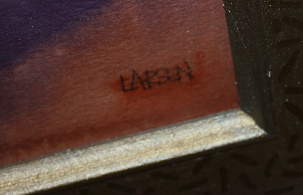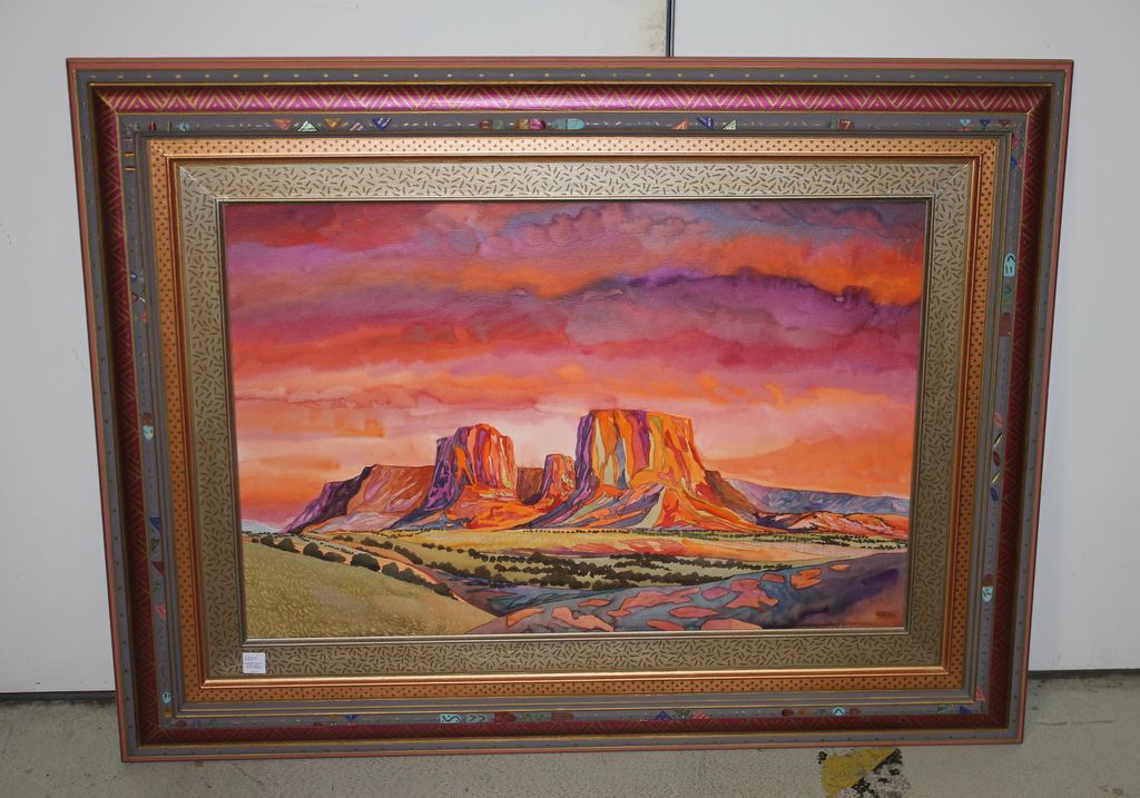 Watercolor "Monument Valley Sunglow" signed Larsen (France) in hand carved and painted polychrome Frame; 42" w., 31" h. Watercolor "Monument Valley Sunglow" signed Larsen (France) in hand carved and painted polychrome Frame; 42" w., 31" h.