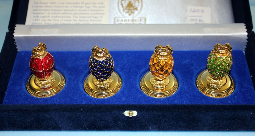 Set of Four Miniature Faberge Eggs from Faberge' Imperial Collection, in box. 2" h. Set of Four Miniature Faberge Eggs from Faberge' Imperial Collection, in box. 2" h.