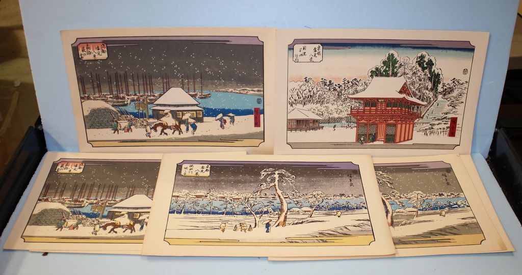 Collection of Seven Hiroshige Japanese Snow Scenes, decorative prints, unframed; 10" w., 16" h. Collection of Seven Hiroshige Japanese Snow Scenes, decorative prints, unframed; 10" w., 16" h.