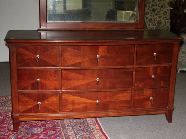 Thomasville Dresser with Beveled Mirror, nine drawer; 65 1/2" w., 20 1/2" d., 75" h. Thomasville Dresser with Beveled Mirror, nine drawer; 65 1/2" w., 20 1/2" d., 75" h.