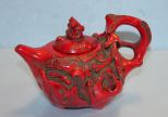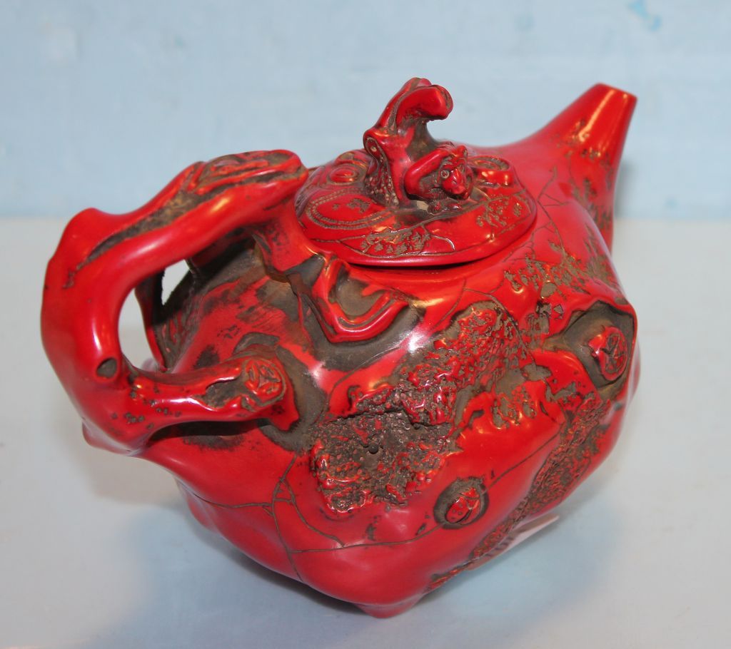 1985 Carved Chinese Red Coral Teapot with Monkey on Lid
