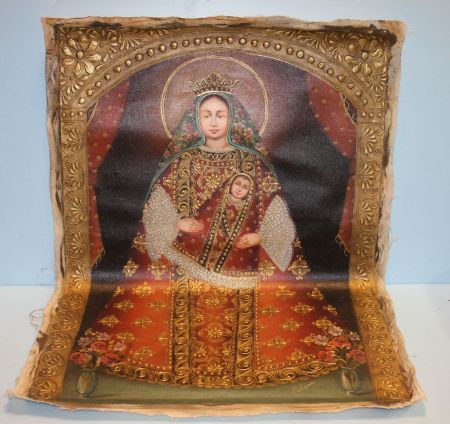 Oil on Canvas of Mother and Child, signed Holgads, unframed fold art Santos; 21 1/2" w., 30" h. Oil on Canvas of Mother and Child, signed Holgads, unframed fold art Santos; 21 1/2" w., 30" h.