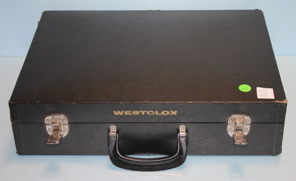 2078 Antique Westclox Salesman Sample Briefcase with Advertising along with Antique Westclox Big Ben Alarm Clock
