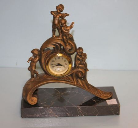 Made in Germany "Mercedei" Cherub Statue (metal) Clock on Marble Base; in working order; base 10 1/2" w., 12" h. Made in Germany "Mercedei" Cherub Statue (metal) Clock on Marble Base; in working order; base 10 1/2" w., 12" h.