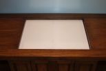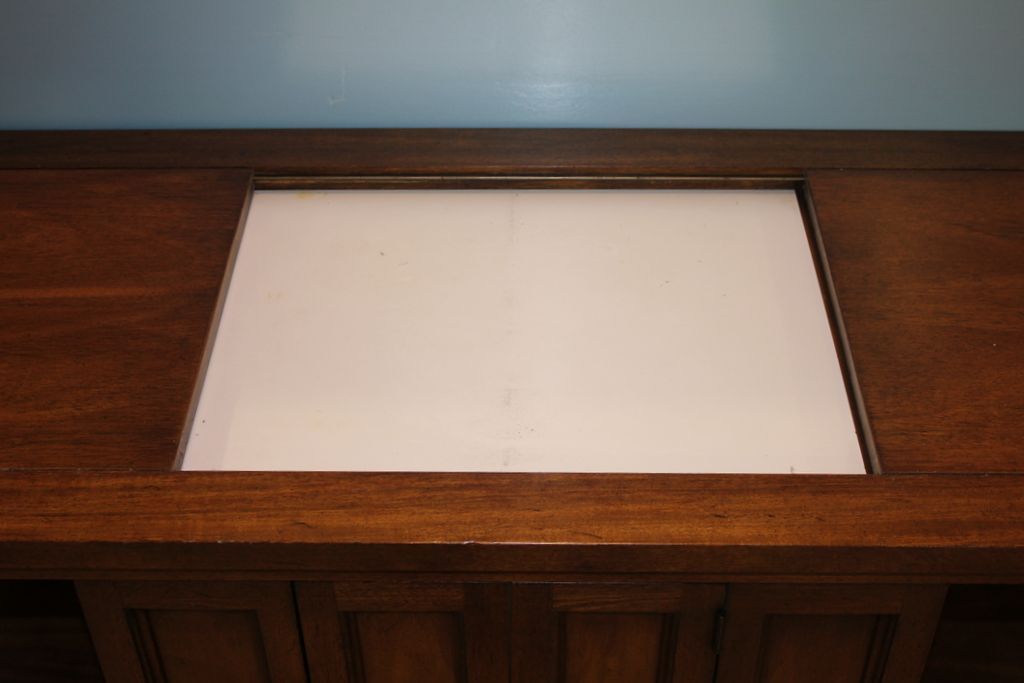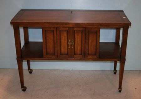 Contemporary Walnut Server, center door, two shelves supported by brass castors; 44" w., 18" d., 31 1/2" h. Contemporary Walnut Server, center door, two shelves supported by brass castors; 44" w., 18" d., 31 1/2" h.
