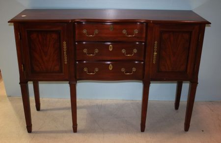 Contemporary Sheraton Style Sideboard, two doors, three drawers, black insizing on doors; 59 1/2" w., 18" d., 41" h. Contemporary Sheraton Style Sideboard, two doors, three drawers, black insizing on doors; 59 1/2" w., 18" d., 41" h.