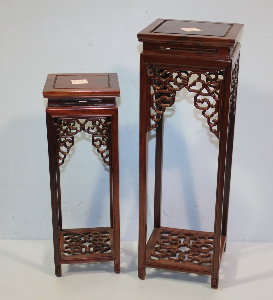Two Hand Carved Wood Oriental Design Vase Stands, 6 1/2" square, 16 7/8" h., 4 1/2" square, 13" h. Two Hand Carved Wood Oriental Design Vase Stands, 6 1/2" square, 16 7/8" h., 4 1/2" square, 13" h.