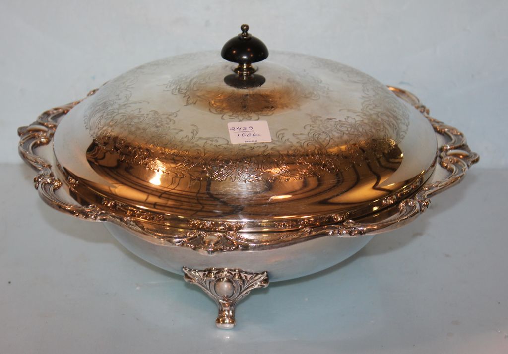 Silverplate Footed Covered Casserole, with black wood finial; 12" dia. Silverplate Footed Covered Casserole, with black wood finial; 12" dia.
