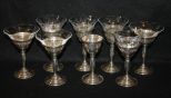 Set of Eight Sterling Glass Holders; 4" h., 2" dia., each having etched glass liner (one missing) Set of Eight Sterling Glass Holders; 4" h., 2" dia., each having etched glass liner (one missing)